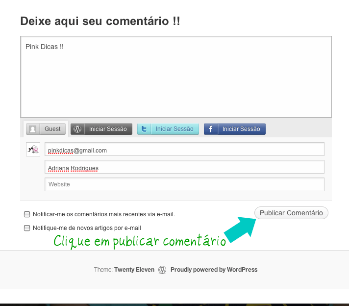 6) Clicar em publicar comentário como indicado pela seta azul na foto abaixo.