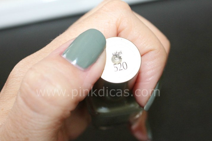 Verde oliva super cremoso, tem um micro brilho azulado mas que não da para notar depois de aplicado nas unhas e também não consegui captar nas fotos, mas ele existe, acreditem em mim, kkkk. Sou muito suspeita para falar sobre esmalte verde, porque eu simplesmente amo todos meus esmaltes verde. Esse é bem discreto, acho que seu nome, o define muito bem, Safari Chic, perfeito!
